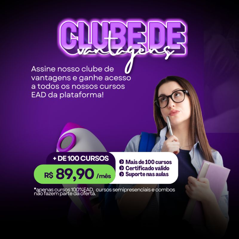 Assine o Clube de Vantagens e tenha acesso ilimitado a mais de 100 cursos livres profissionalizantes 100% EAD. Uma assinatura mensal pensada para quem quer se qualificar, evoluir na carreira e aprender no seu ritmo, com certificado válido e suporte durante as aulas — tudo isso por um valor acessível. (oferta válida apenas para cursos 100%EAD